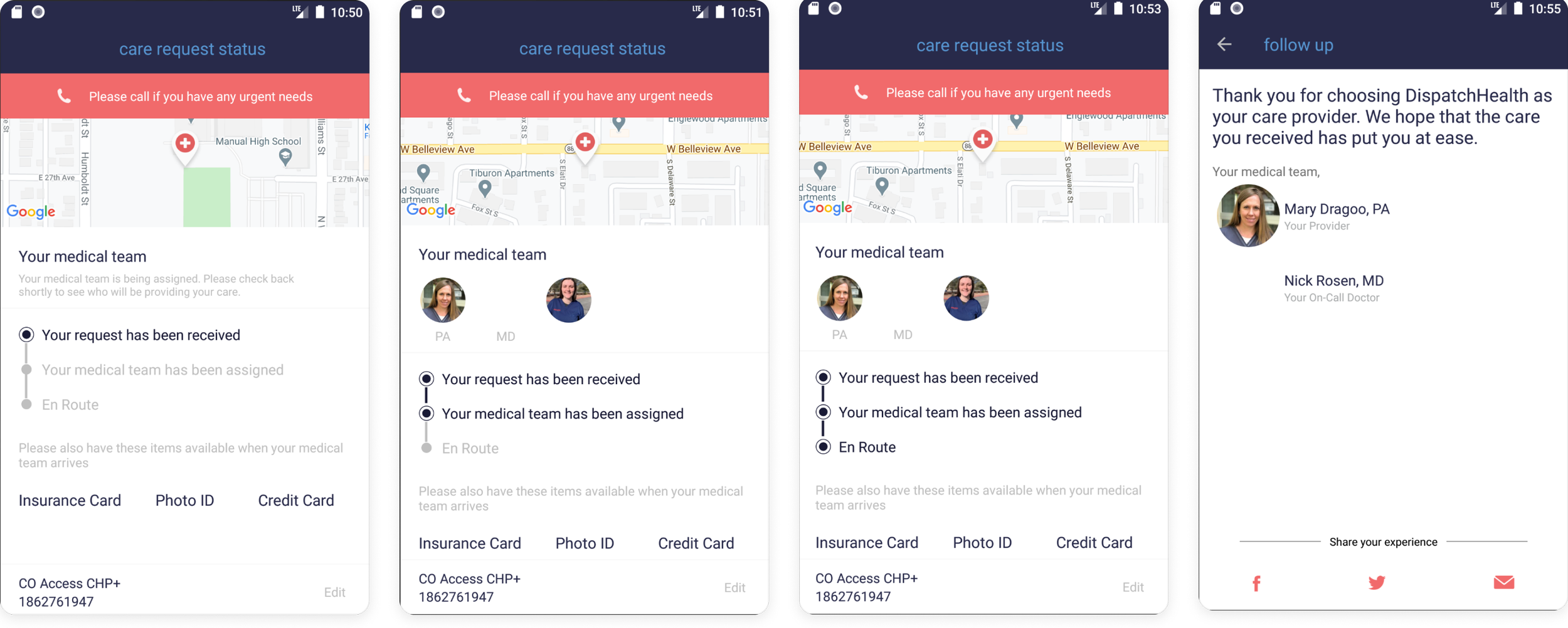 To improve visibility of time-sensitive appointment updates, we introduced a new dynamic status modality that would update throughout an active request, leveraging data we already had. We removed the static destination map to eliminate confusion around real-time tracking and added a new status trigger to indicate when the medical team arrives on-site — a key moment for both patients and staff.
