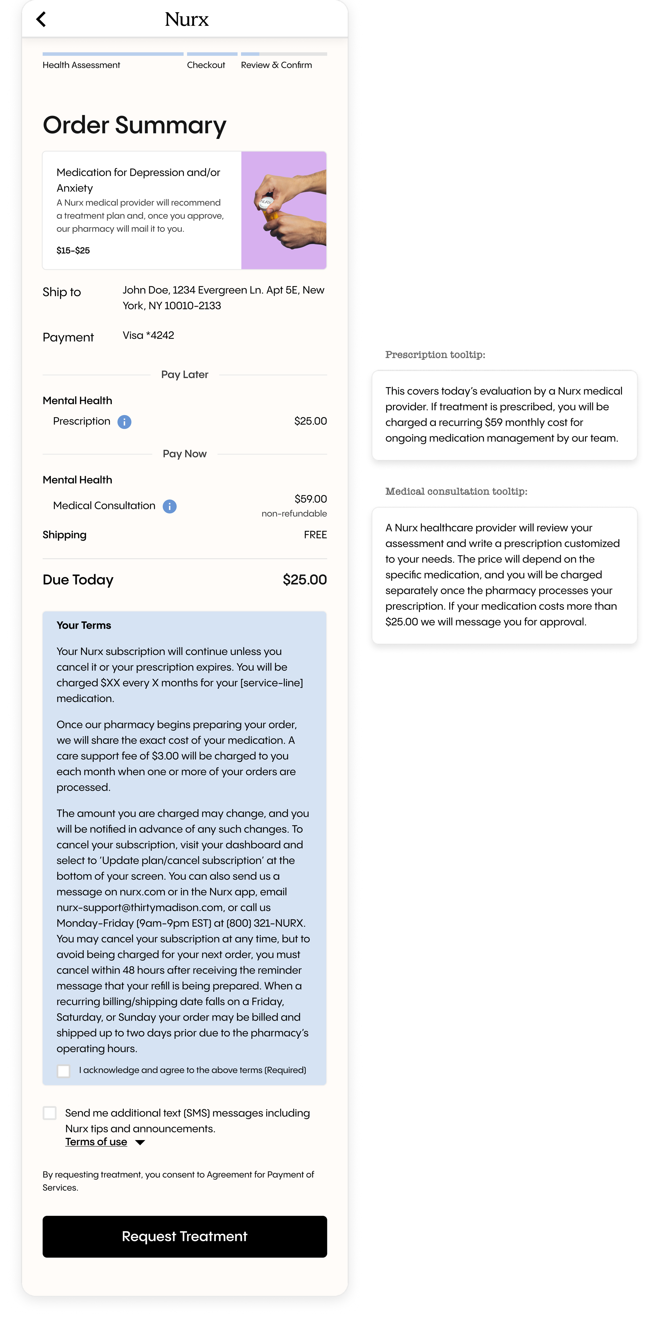 We reevaluated the content with clarity as the priority, reorganizing the hierarchy to accurately reflect the checkout offering—provider care with the potential to prescribe. Any language suggesting that medication was required for payment was removed.